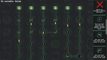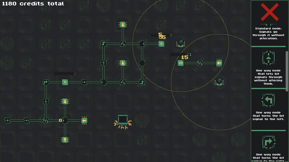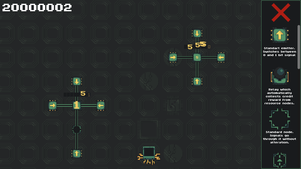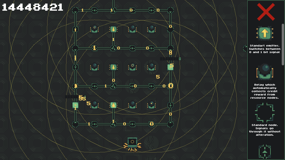 Main Core Node produces signal that any pulse nodes can recieve. In return, they emit single bit along hte connections. Various different nodes can alter the bits along the way, redirect them and multiply. Invoking bit order of resource nodes (from right to left) makes them produce "credits" - local currency. Create complicated and efficient setups, earn credits and purchase upgrades. Oh! And there are also demons...